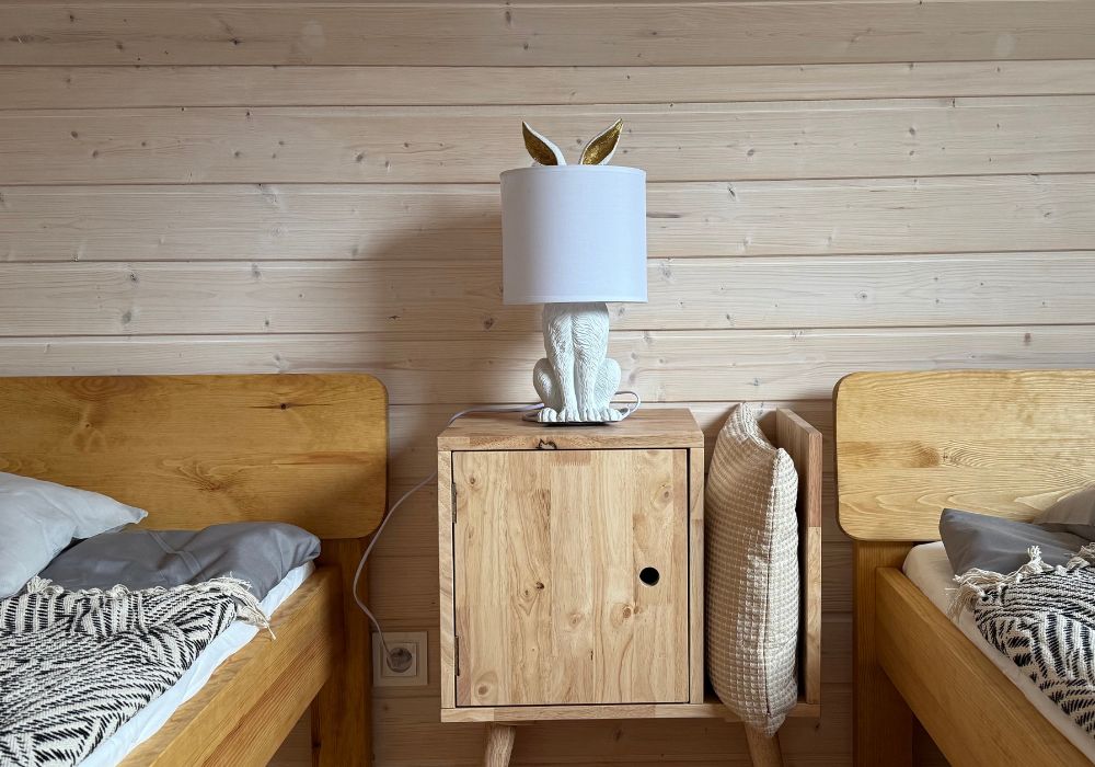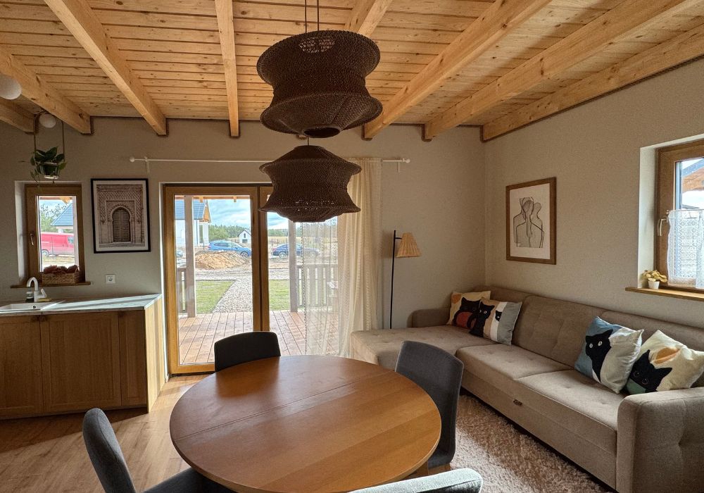 Każdy domek to osobna historia. 8 dzieci, własny kominek, taras z widokiem na las. Zero hotelowej anonimowości – tu każdy ma swoje miejsce przy stole i swój ulubiony fotel.